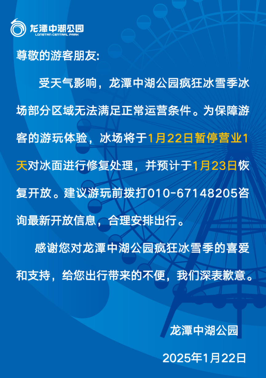 龙潭中湖公园冰场今日暂停营业,对冰面进行修复处理